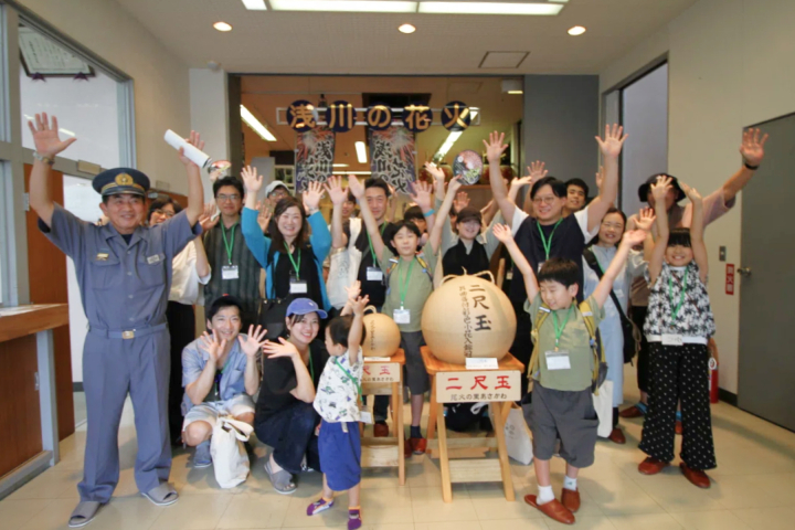 各家庭で花火が製造されていた当時の秘伝帳や花火づくりの道具などを展示。実際に触ったり持ち上げたりできる花火玉の模型も人気です。