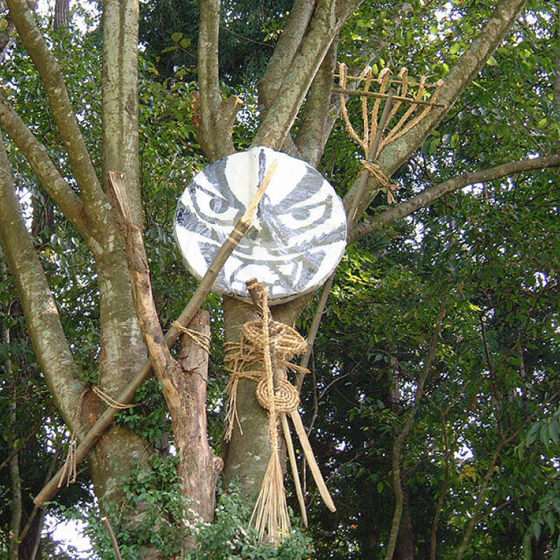 農作物を台風の被害から守るため、五穀豊穣と嵐除けを願う「風袋様」。藁・紙・木で嵐除けの顔を作り、木々に飾りつけます。長刀や太刀を持たせて嵐を払い、大きな口で嵐を吸い込むと言われています。