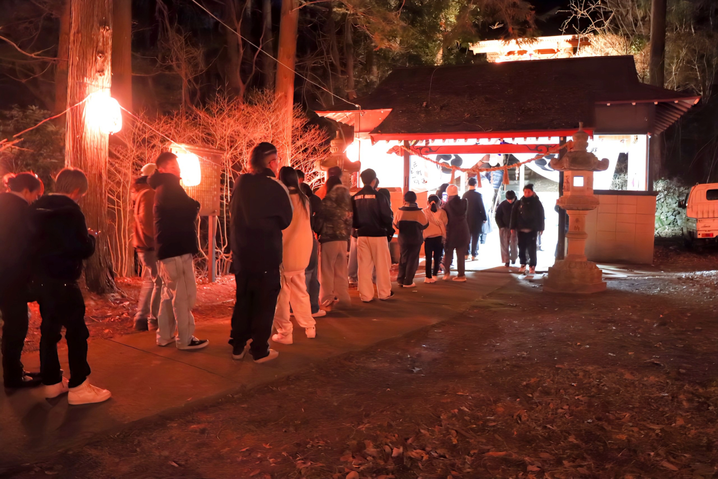 元旦の午前0時から108発の花火が打ち上げられる「除夜の花火」が終わると、来場者は白山比咩神社の元朝参り(がんちょうまいり)に向かいます。参道には200もの提灯が灯され、幻想的な雰囲気の中で参拝客を迎えます。