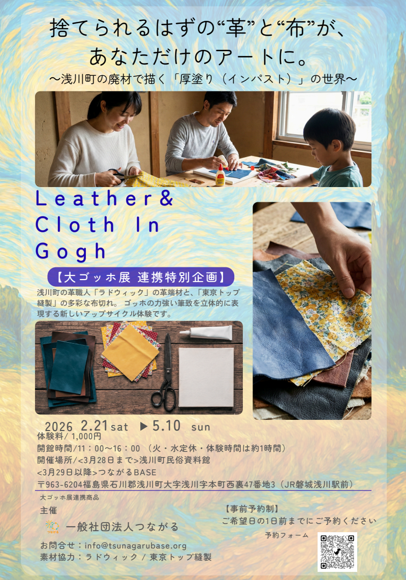 今回、一般社団法人つながるが主催するのは、革や布の「端材」を使って名画を描くアートワークショップ「レザー&クロース・イン・ゴッホ」です。絵の具を使わず、素材の持つ質感や立体感を生かして、あなただけの自由なアート制作を楽しんでみませんか?